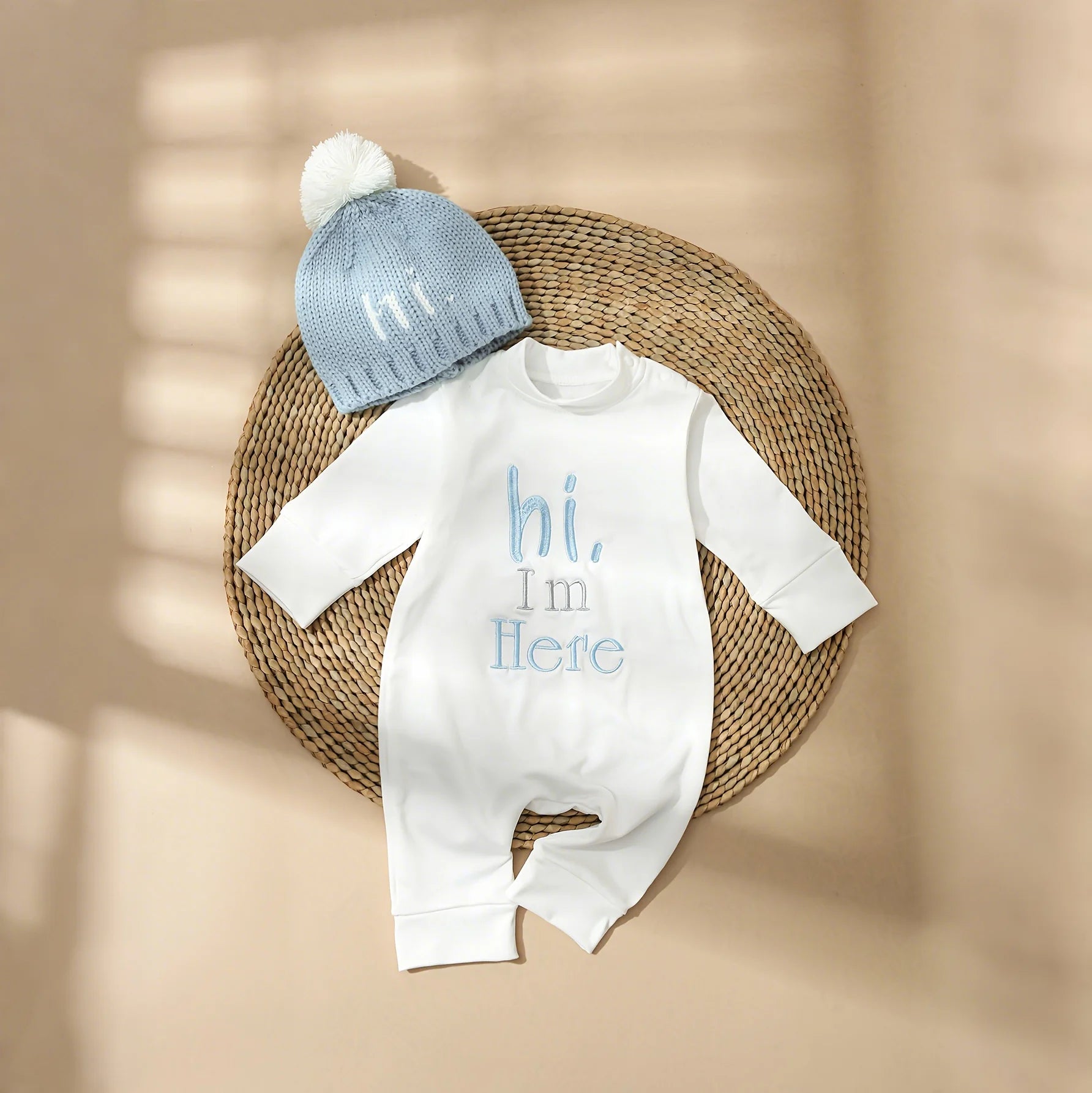 Ylsteed 2Pcs Set HI i am here Embroidery Newborn Photography Jumpsuit with Knitting Pom Hat Baby Boy Outfits for Photo Shooting